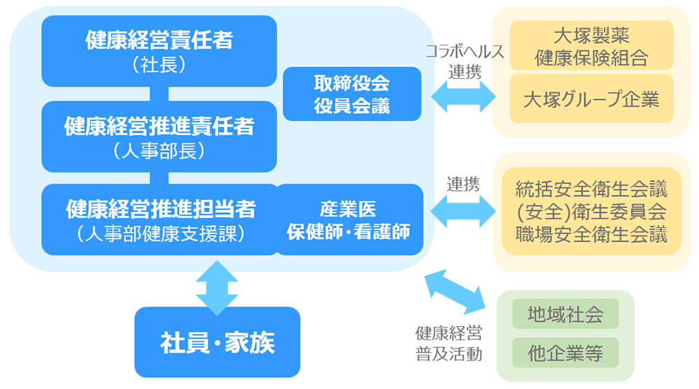社長をはじめとする経営層のコミットメントのもと、健康経営推進責任者や健康経営推進担当者と専門職、各チーム、各部門などが有機的に連携し、全社員が参画し、社員の家族含めた健康経営に取り組んでいます。また、大塚製薬健康保険組合や大塚グループ企業と情報交換・連携しながら健康経営を推進しています。自社以外にも、取引先等他企業、地域などへの健康経営普及活動も行っています。健康経営の推進方針に基づき、各種指標の評価などを検証しながら継続的に進めています。