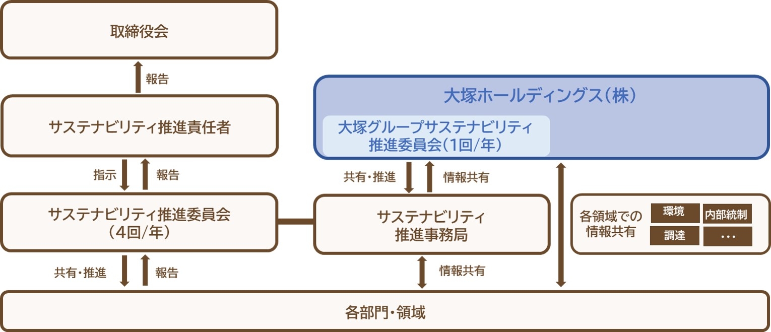 体制図。サステナビリティ推進責任者→サステナビリティ推進委員会(4回/年)、各部門・領域の順に指示と共有・推進。各部門・領域→サステナビリティ推進委員会(4回/年)→サステナビリティ推進責任者→取締役会の順に報告。大塚ホールディングス(株)の大塚グループサステナビリティ推進委員会(1回/年)からサステナビリティ推進事務局へ共有・推進、サステナビリティ推進事務局から大塚ホールディングス(株)の大塚グループサステナビリティ推進委員会(1回/年)からサステナビリティ推進事務局へ情報共有が行われる。サステナビリティ推進事務局と各部門・領域の間では相互に情報共有が行われる。大塚ホールディングス(株)と各部門・領域の間でも相互に環境、内部統制、調達など各領域の情報共有が行われる。