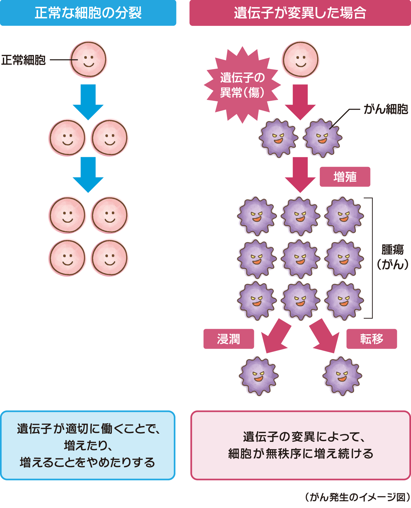 細胞の中にある遺伝子は、それぞれ決められた役割をもって働いています。その役割の1つが、細胞の増殖とその抑制です。正常な細胞は、体や周囲の状態に合わせて遺伝子が適切に働くことにより、増えたり、増えることをやめたりしています。
