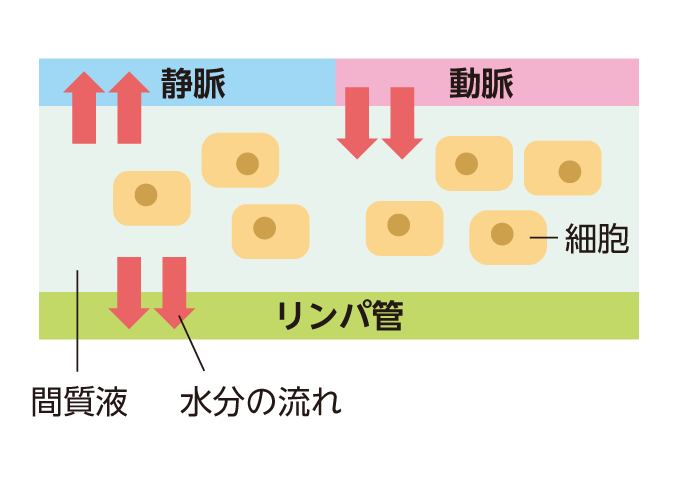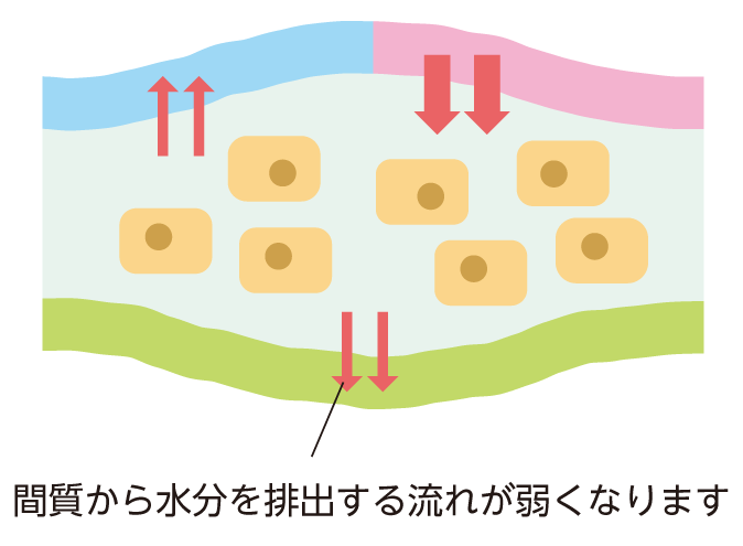 - A2立ちっぱなしや座りっぱなしの状態が長時間続いたり、体の一部に負担がかかったりすると、体内の水分移動に関係する血液やリンパ液の流れが滞ることがあるため、注意が必要です。