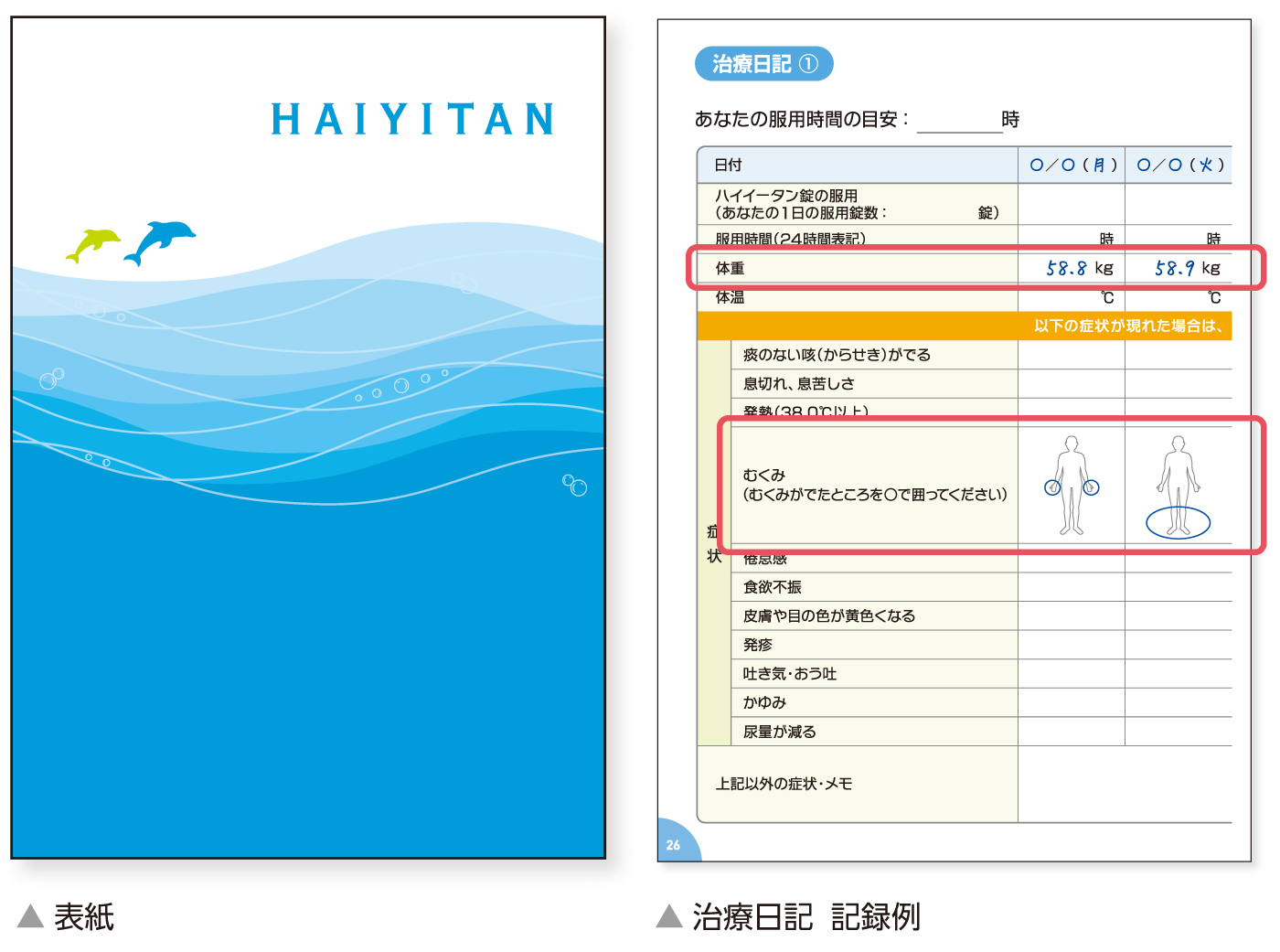 むくみが気になる部位について「服用のてびき」巻末の治療日記に記録しておきましょう。