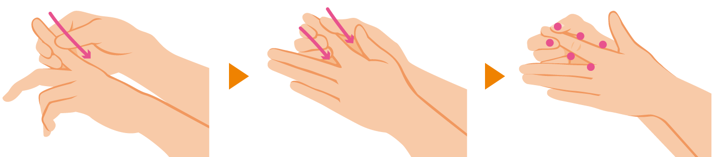 指先を親指と人差し指でつかみ、根元に向けて、手の位置をずらしながら押すようにもみほぐします。