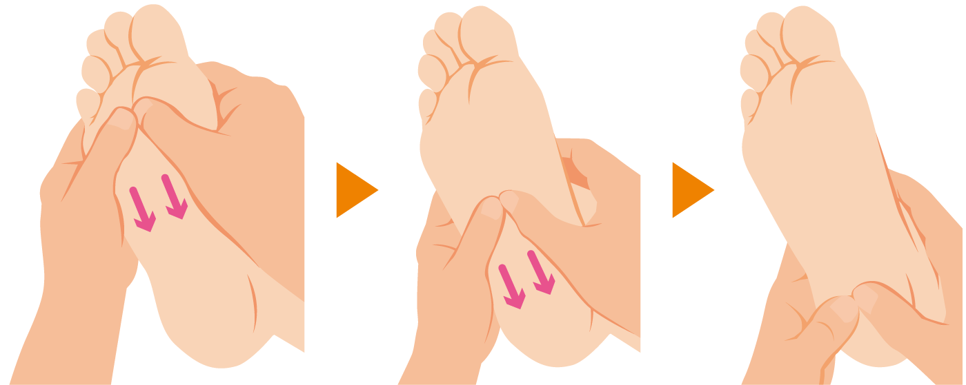 両手の親指を使い、足の各指のつけ根からかかとまで足裏全体を押します。心地いいと感じる強さが適度です。