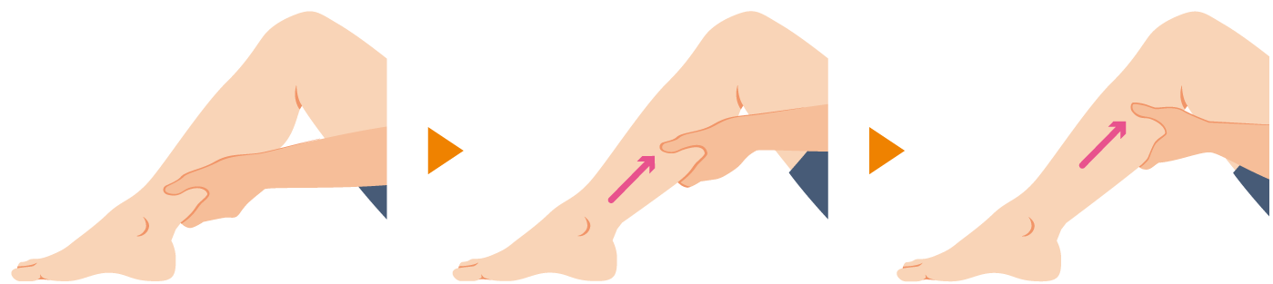 両手を使って、足首からひざに向けてなでるようになめらかに押していきます。左右とも5回程度行うのが目安です。