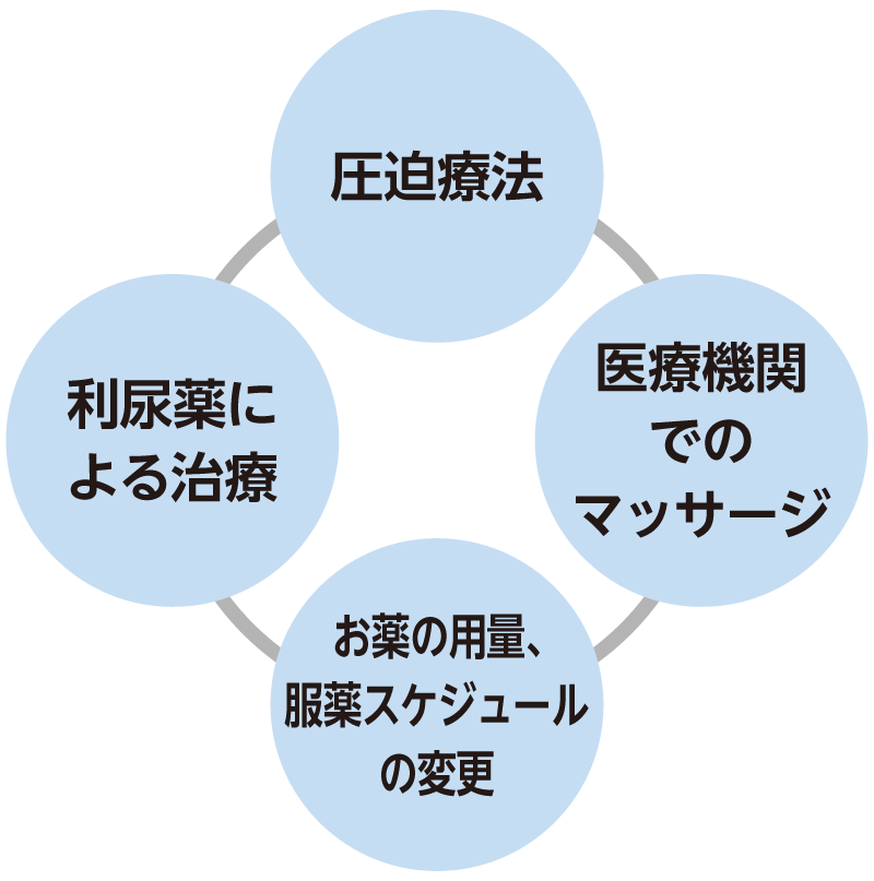 - A1例えば医療機関では、むくみがある部位を適度な力で継続的に圧迫することで、症状の悪化を予防する「圧迫療法」を行う場合があります。