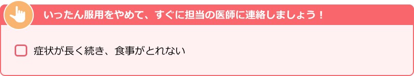 薬の影響を受けて、食欲が一時的に低下することがあります。食事や水分がとれなくなると脱水症状になりやすいので注意が必要です。
