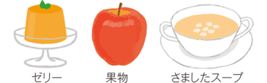 - 食べやすい食品:ゼリー、果物、さましたスープ